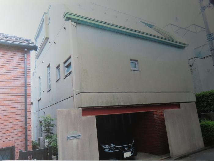 外観、道路よりガレージを入れて斜に見上げる。屋根の銅板葺きの緑青、ガレージの鉄骨の赤色が印象的である。