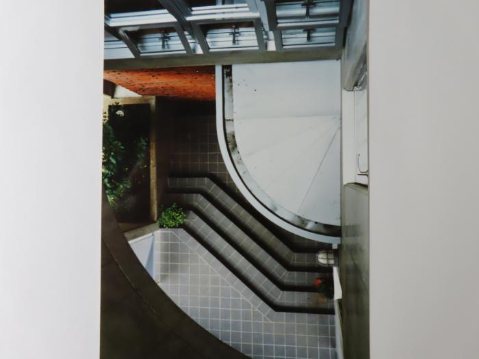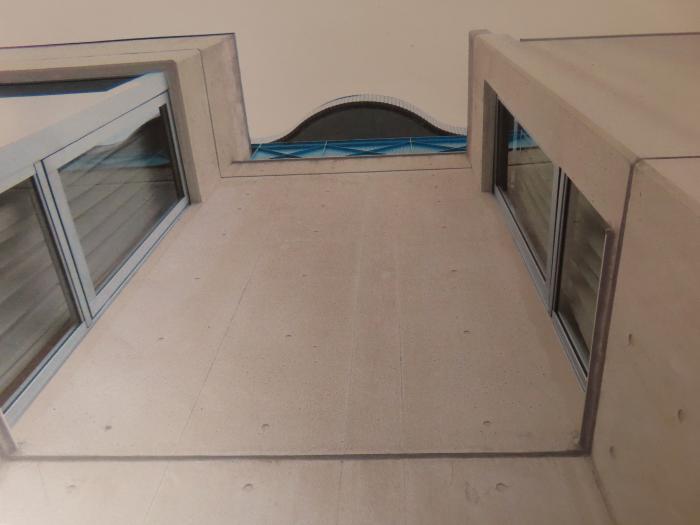 南面コンクリート打ち放しスのくぼみ部分の見上げ。3階バルコニー庇の局面がみられる。