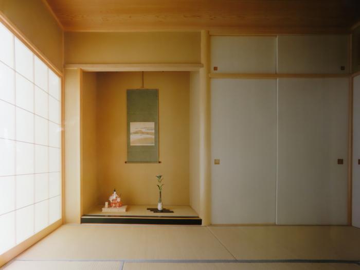 和室、障子の大きめ組子割付や襖の太鼓貼り、畳縁の色によって実質よりも広く感じられる。