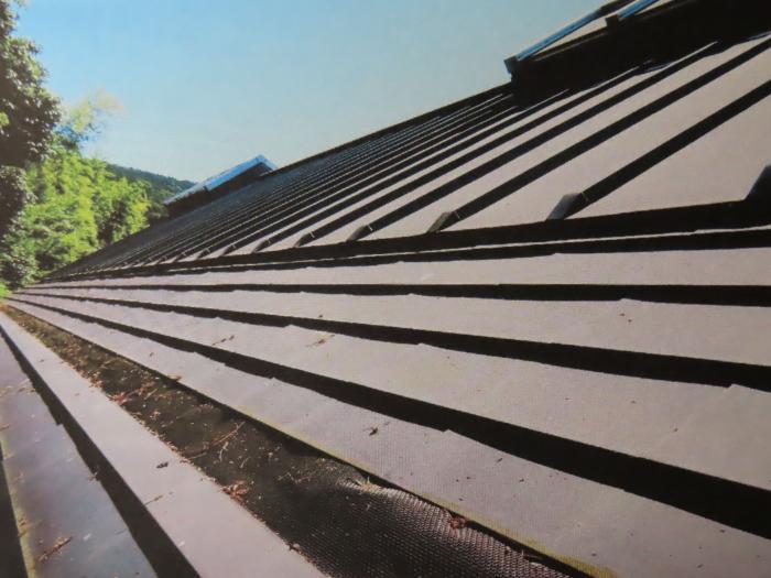 本屋根はガルバリューム鋼板縦瓦棒葺き、先端部分はガルバリューム鋼板平葺き内樋納まり。