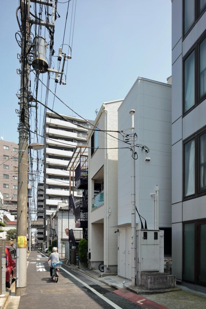 東京の下町。袋小路の路地のような間口が狭く奥行のある敷地に建つ重層長屋形式の賃貸併用住宅です。