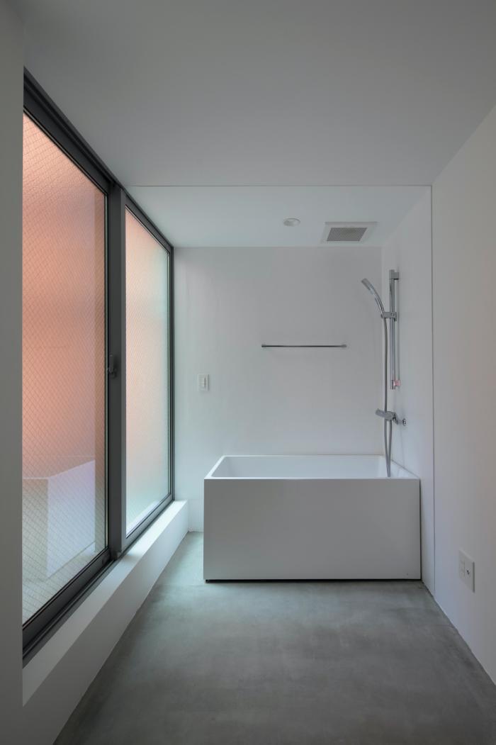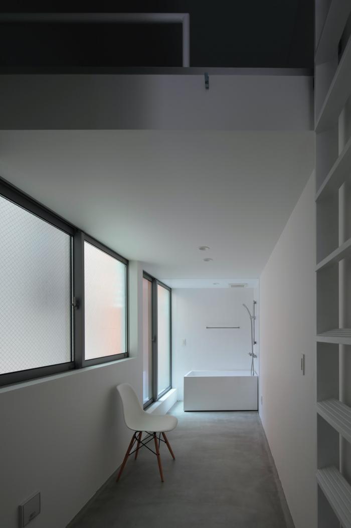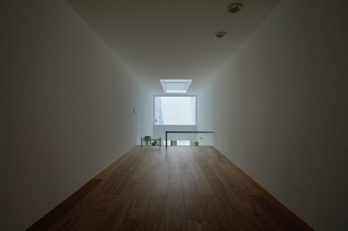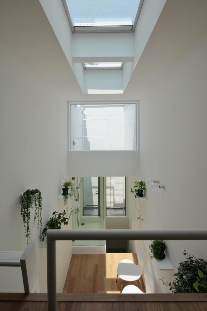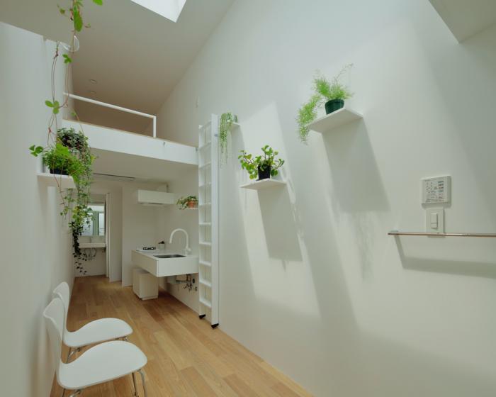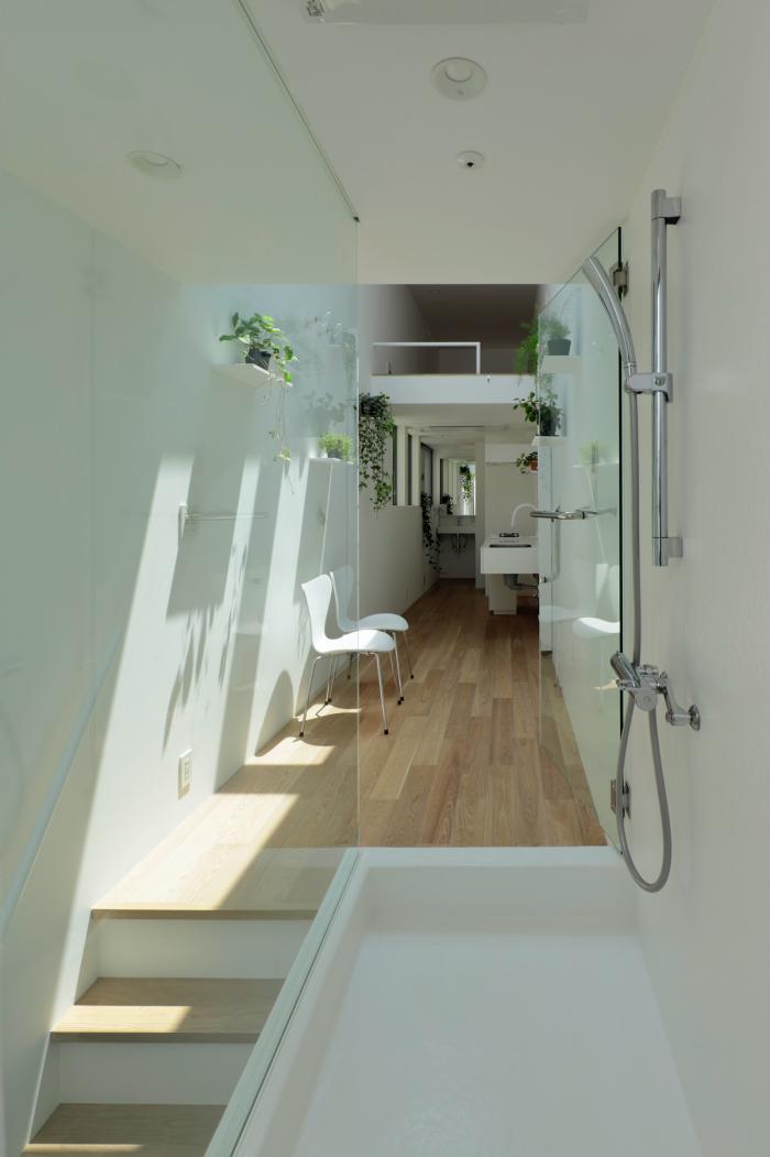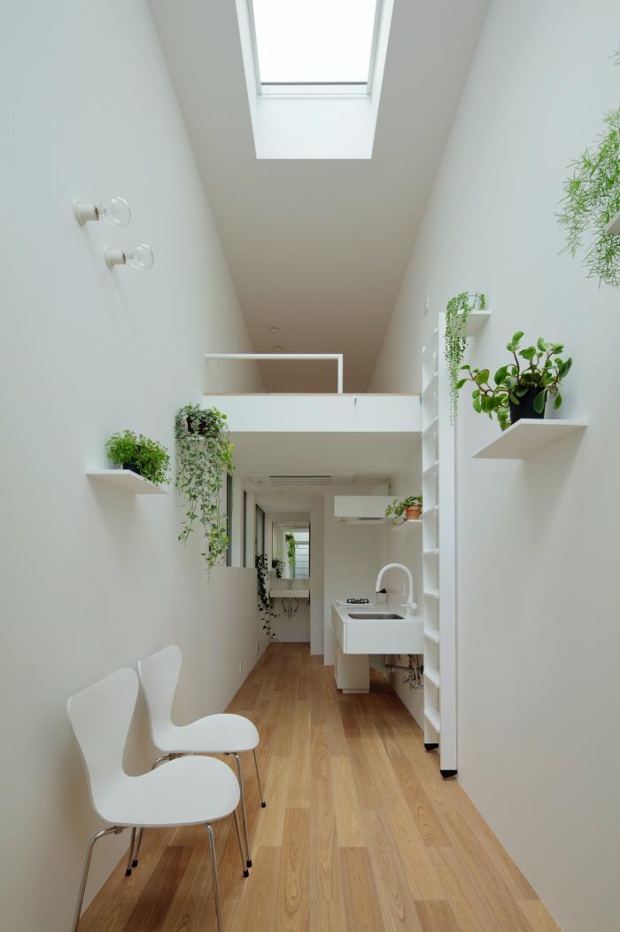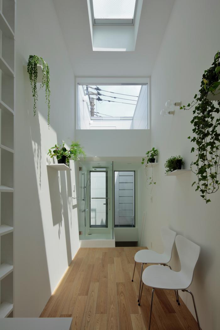 敷地の間口は細いところで2.4m、広い場所でも2.7m程度しかありません。そんな空間をすっと切り取るように壁を立てて生まれた場です。両サイドを高い壁に囲まれた室内は、壁に付加された植栽の雰囲気とも相まって、まるで街路の一部であるような内外が不確かな場所になります。そこでは路地に入ったときのような独特の心地よさを感じることができます。それは、きっとこの場所でしか享受できない体験です。