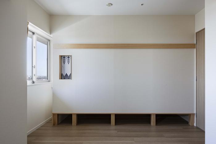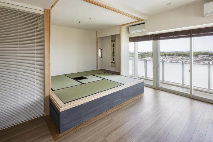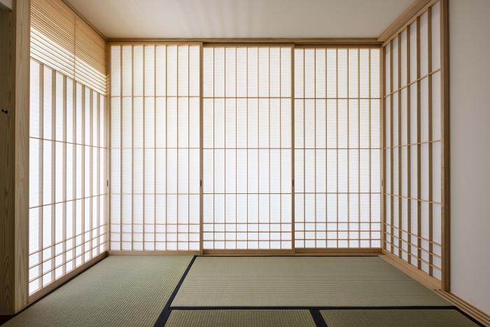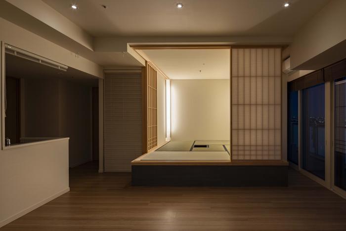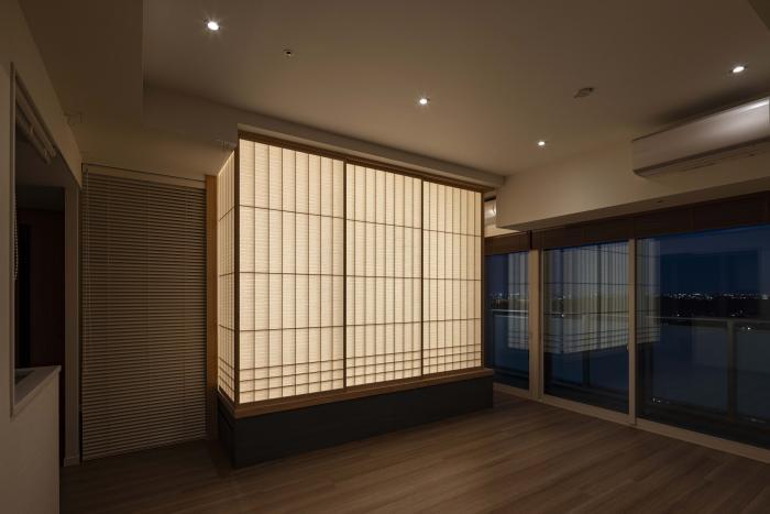 元々リビングに面した部屋の壁と引戸を解体し、サッシやエアコンは活かしつつ、リビングに対して障子で開いたり閉じたりできる構成の茶室とした。既存の窓を活かすため、部屋の中にまた部屋がある入れ子状の構成とした。障子を閉めれば客室としても使える茶室であり、障子を取り外せばリビングと連続する小上がりの和室でもある。取り外した障子は行燈照明側の敷居と鴨居に収納しておく事もできる。