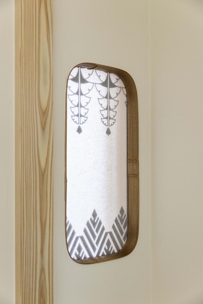 床の間の墨蹟窓には家紋をモチーフにしたデザインの障子を取り付けたい。