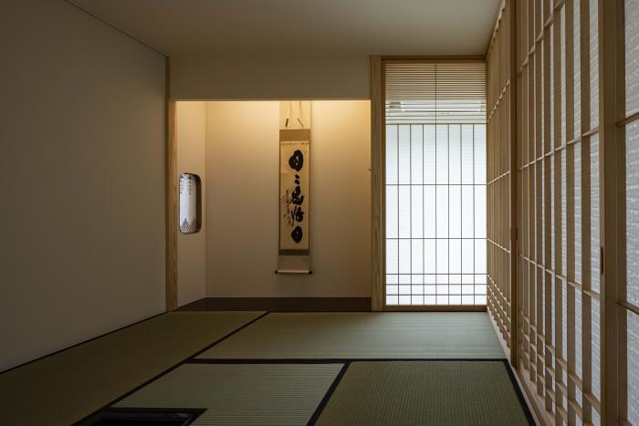 茶室は床を上げ、納戸から使える床下収納として、茶器類を収納することができる。納戸側の壁には着物を掛けられるように長押を設えた。茶室の畳は熊本県産藁床の本畳とし、炉畳には電熱炉を設えた。炉の真上には天井下地を補強した上で釜蛭釘を差し込んだ。