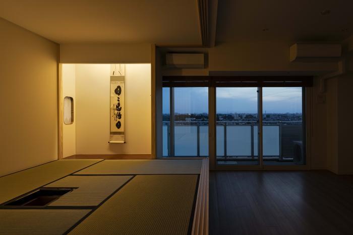 マンションの住戸の中に四畳半の茶室を設計した。施主は表千家で茶道に親しみ、自宅住み替えのタイミングで新たに取得した住戸を改修し、茶室を設えることにした。求められたのは、お茶会の開ける茶室で、「真・行・草」の設えで言うところの、「行」の設えでありつつ、比較的新しいマンションのインテリアとの調和である。