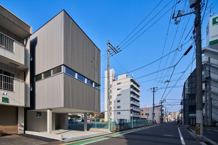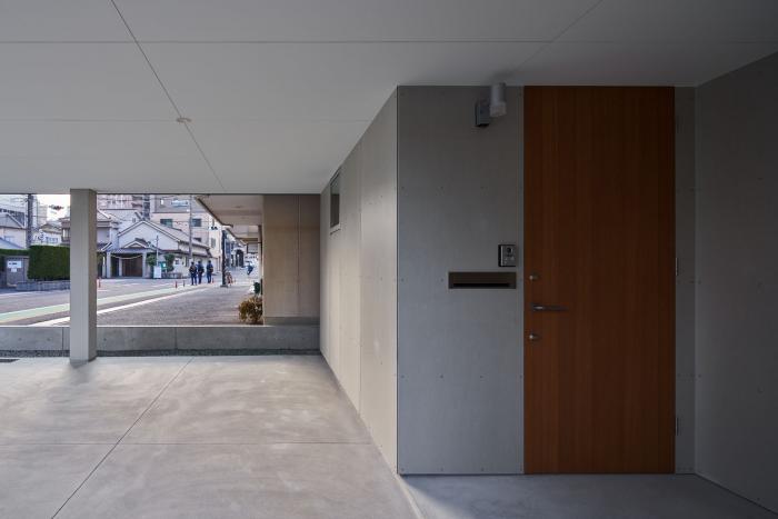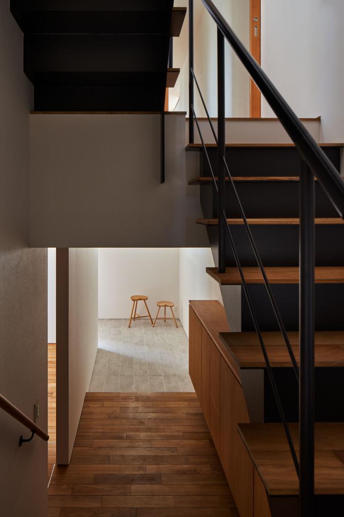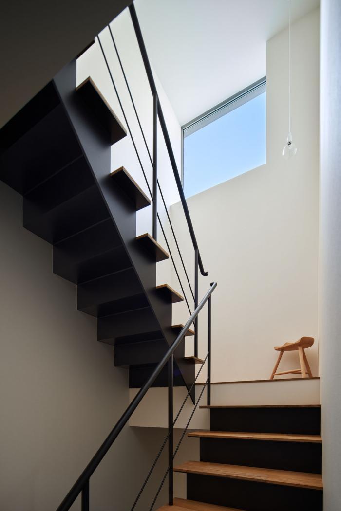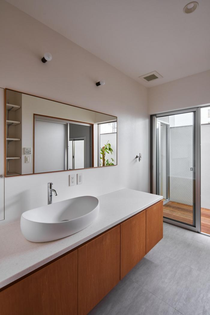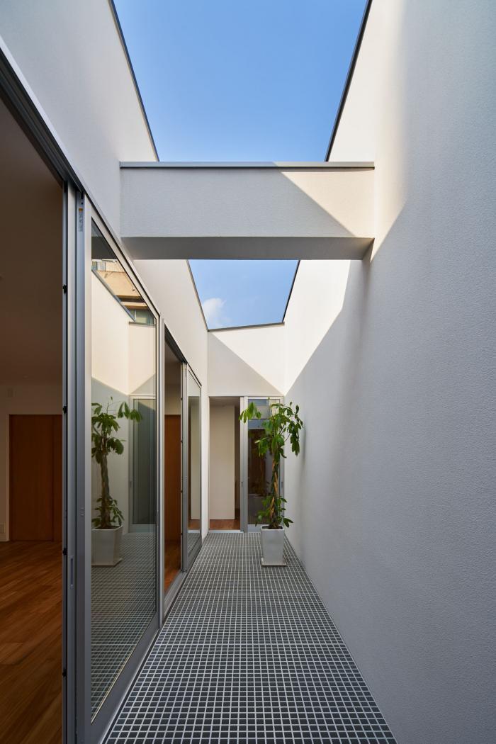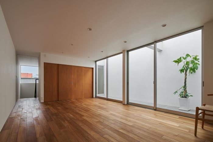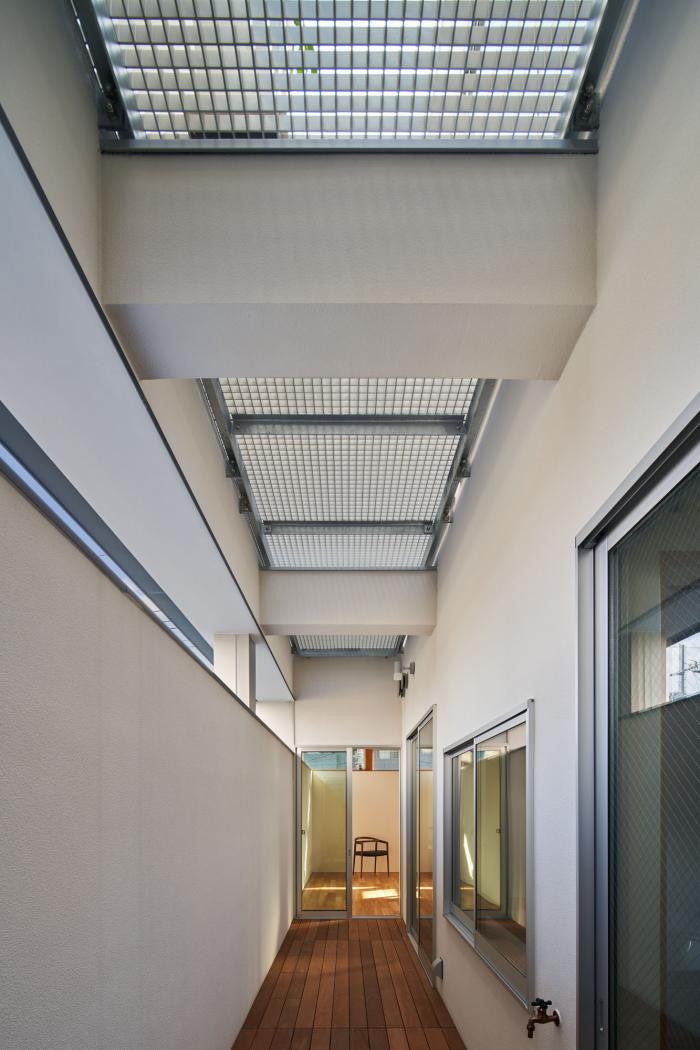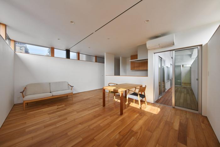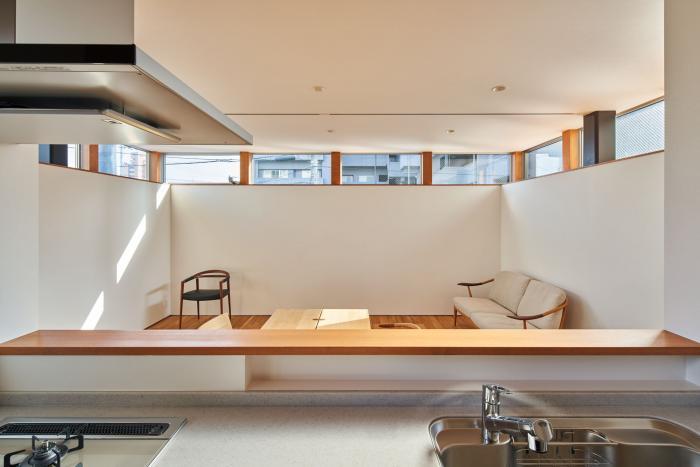 敷地は駅からほど近く、周囲を住宅やマンションに囲まれた場所。ここで求められたのは「明るく、居心地の良い家」だった。東側に公共施設の青空駐車場が広がり、明るさを取り込むには好条件だが、人や車が頻繁に出入りするこの方向に大きな窓を設けるのは、明るさを得ることよりも他に得られないものの方が大きい気がした。光を取り込み、風を通し、室内を開放的にするため、内外の境界として窓が必要になるが、壁を大きくくり抜く窓は、外部環境を享受する代わりに外部にとっても内側の存在をはっきりと認識させてしまうことになる。その結果として都市住宅では昼夜問わずカーテンが閉められ、周囲に閉じているというメッセージを放つことになる。そこで、この建築では窓の持つオブジェクトとしてのメッセージ性を捨て、生活の背面にそっと佇む”単純機能としての窓”として扱うことで豊かさを作り出せないかと考えた。単体の四角い窓を部屋ごとに点在させるのではなく、建物をぐるりと囲った細長いスリット窓から天井や壁を伝いながら柔らかな光が入って来り、バルコニーの内壁に反射した優しい光が窓を通って室内を包み込む。行き止まりの無い回遊型の平面プランも光や風を建物の奥まで運んでくれる。風景を切り取るなどの美的な性質を持ち合わせていない、通風・採光だけを期待された単純機能の窓だからこそ、カーテンやブラインドを設置しなくても生活出来る。さらに、この建物では屋根を設けていないバルコニーを縦のヴォイドとして挿入しており、日差しや雨は2階のウッドデッキまで落ちていく。プライバシーの中に外部環境を取り込みつつ、回遊動線の一部として挿入されたバルコニーは、普段は外部であるがフレキシブルに内部へと表情を変える。その表情の変化は点と点を結ぶ線の長さを変え、建物の広さとは異なる生活の拡がりを与えてくれる。都市住宅として開きすぎないことでプライバシーを確保しながらも、内側からは光・風・空を感じて生活することが出来る「明るく、居心地の良い家」になった。