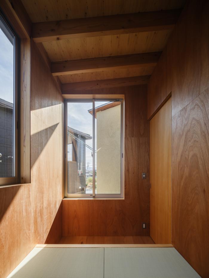 敷地は広島県福山市郊外の新興住宅地。周囲を個人住宅や集合住宅に囲まれ、東側以外の3面を道路に接する角地である。3方向道路という条件から、特徴的な開口部をもつ外観とすることで街との関係性を深め、福祉施設としての質を特徴付けることを考えた。建物は南棟を主機能として1階に機能訓練室、2階に事務室を割り当て、北棟は各階の関連機能を集約したシンプルな構成としている。敷地に対してひとつの大きなボリュームを配置するのではなく、分棟型とすることで各棟を周囲から逸脱しないスケールとし、くの字に曲げて接続することにより敷地の余白に奥行きを作りながら用途の強さを緩和している。構造架構についてもシンプルな掛け方とすることで、街と素直に向き合うことを意識している。南棟の立面を大きく占める開口部は、機能として彩光や通風を積極的に取り込みつつ、季節や時間と共に内外の距離感を変化させ、それぞれが異なる窓辺を構成している。リズミカルに大きさを変えて並ぶ連続窓は、リハビリにおいても視覚的な刺激を与える役割を担う。一方で、外から見ると、機能の枠を超えた大きな窓を構成し、この施設の目指しているオープンな活動を形として表現する立面となることを意識している。住宅地への福祉施設の挿入という課題に対し、機能やディテールが街と連動することで特徴的な福祉環境を生み出しながら地域を明るく照らす顔となる建築が出来上がった。