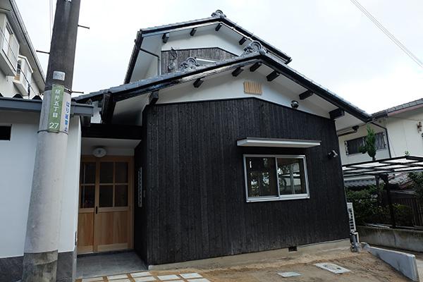 家の外観は変えず塗装ではない本焼杉を外壁に貼り、将来カフェを営みたいというご希望でキッチンから道路が見える窓、木製玄関ドアを入ってすぐに土間キッチンへ入るよう計画しました。左の小屋は陶芸用電気窯置場です。