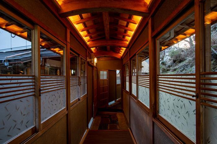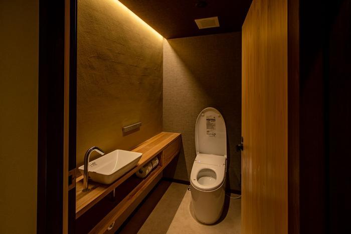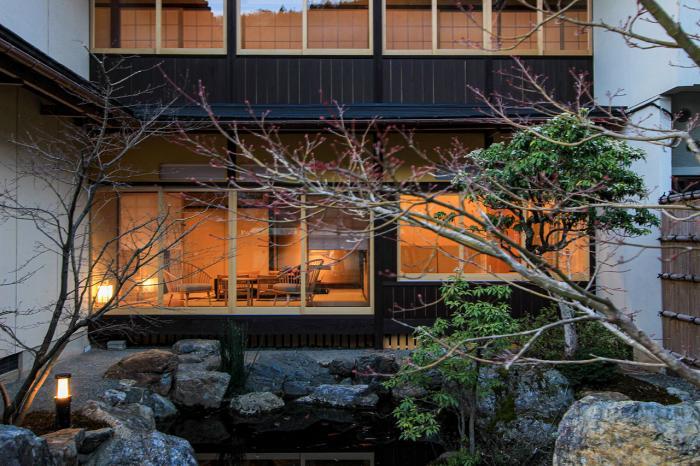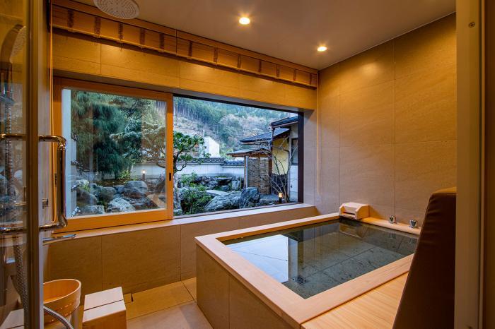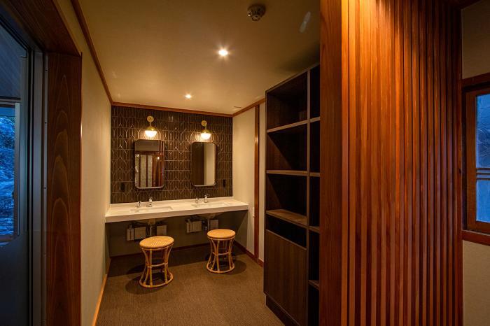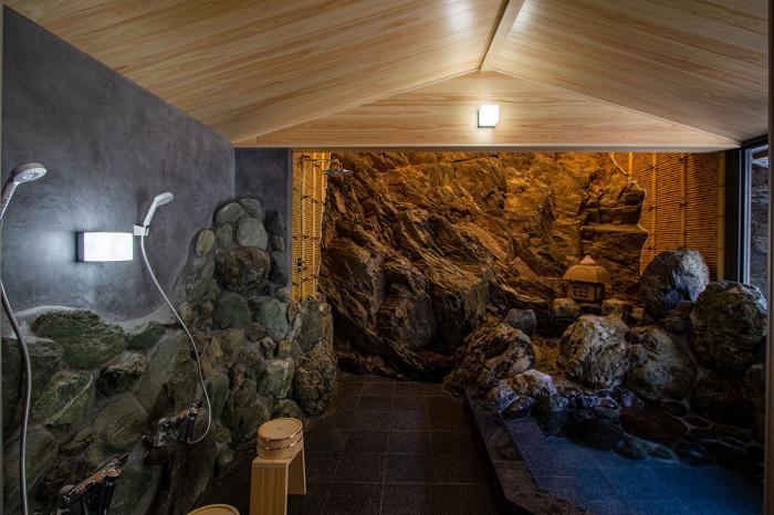老舗旅館の持つ伝統的な和の様式を継承しながら、現代の感性を融合させることにより、最先端の設備と上質なデザインを形成しています。裏山の岩肌を浴室に巧みに取り込んだ岩風呂など、浴室環境に天然素材・自然素材を積極的に使用し、非日常の温浴デザインを構築しています。
