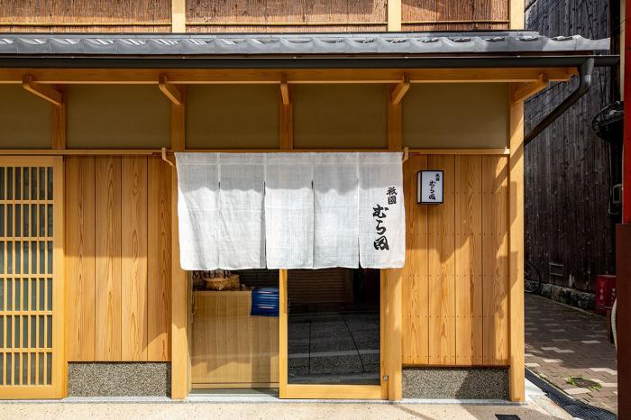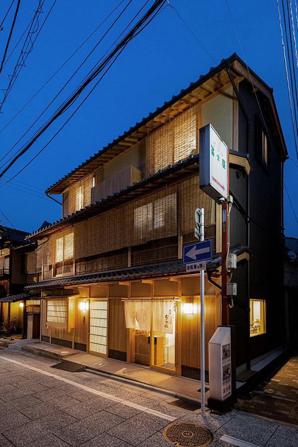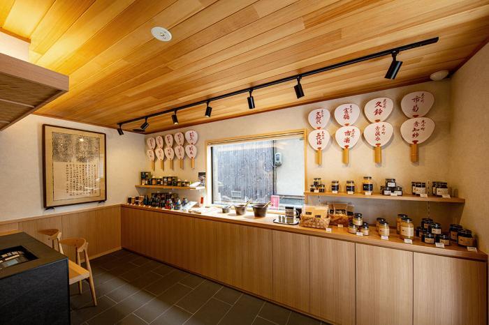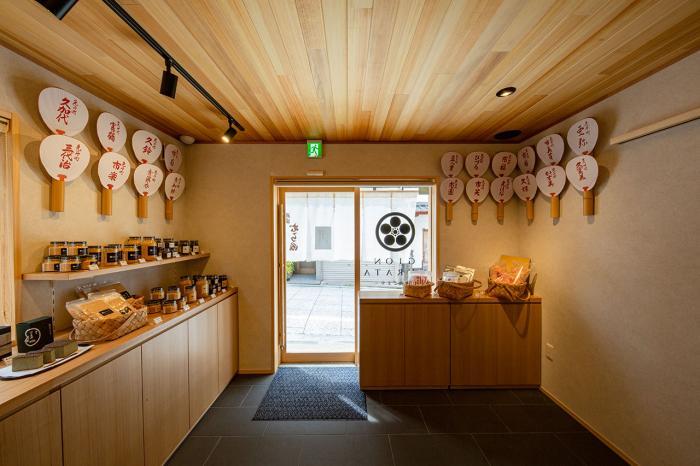 木造3階建てでありながら、端正な京町家の美が街路に映えるように細やかな意匠計画がなされています。色使いも鮮やかな瀟洒な店内では、有名料理店、有名料亭、有名ホテル等にて愛用されている「ごま」の販売を中心に、本当にいいものをだけが取りそろえられています。