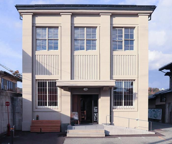 この建物は、昭和10年代に建設され、もともとは銀行として使用されていました。改修にあたっては、当時のデザインを生かして新しいデザインとの融合を試み、大江町まちなか交流館「ATERA」として生まれ変わりました