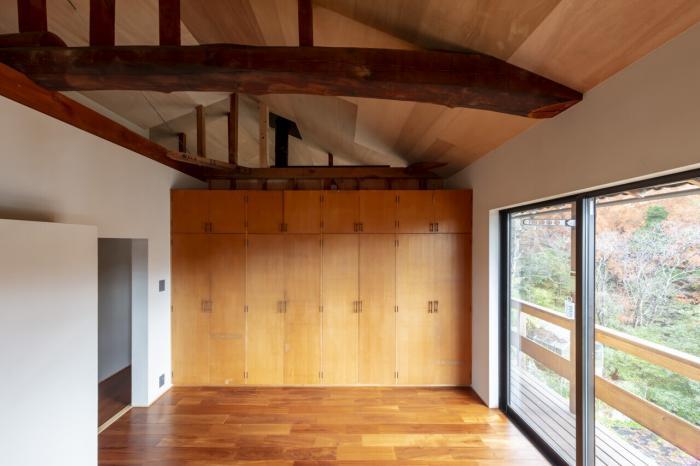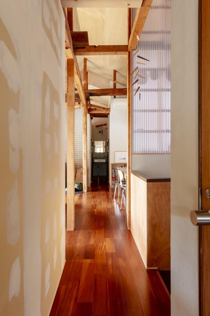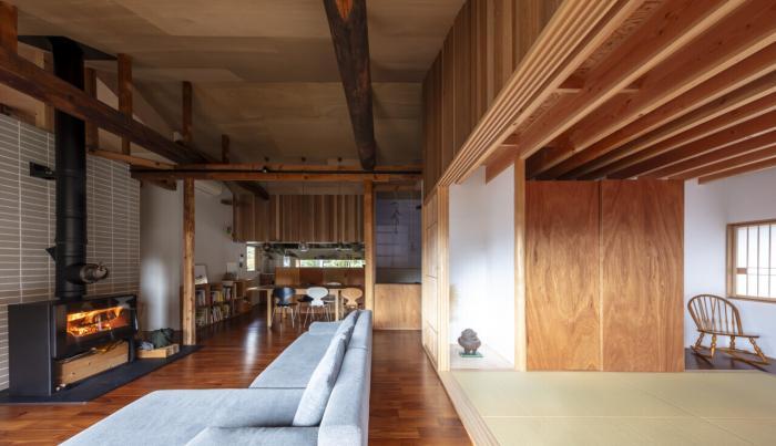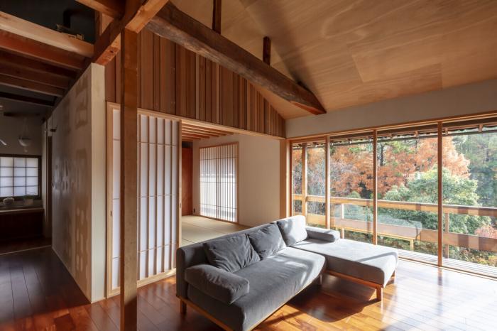 解体時に出た材料を選別し、再利用できるものは新しい計画で仕上げ材などに採用した。もとの間取りを大きく変更せずに、新しい生活スタイルに沿うよう大きなワンルームへと更新した。既存建物の開口部を生かし、ガラス面は複層にするなど断熱性能の向上を図った。