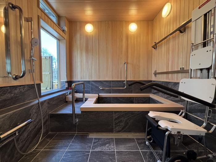 木と自然石調のタイルによってユニットバスに無い温泉のような雰囲気とすることで利用者が特別な時間を過ごせるようにしています。