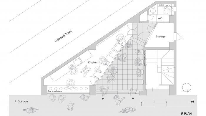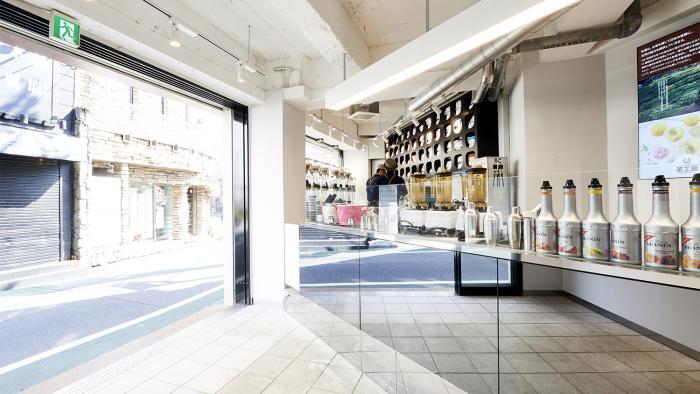 店舗の窓辺には、今回店舗のために特注製作されたガラス製の給茶マシーンを並べ、通りを歩く歩行者たちの目を楽しませます。中央のカウンターは、ファサードラインに対して斜めに配置し、長さを最長化することで、客と店員のインターフェイスを最大化し、コミュニケーションを取りやすくすると共に、キッチンでお茶を作る様子を眺めることができます。カウンターの表面は鏡面張りとすることで、中と外の風景を互いに写し出し、外部空間を内部に取り込むことを意図しています。客用スペースの床仕上げは通常外部で使うコンクリート平板とすることで、客用スペースを外部空間の延長と捉えました。その結果、街歩きをしながら立ち寄りやすい雰囲気を醸し出すと共に、グレートーンの工場のようなインテリアとしました。キッチンをディスプレイ化し、自由に入れる外部空間の延長として内部空間を作りこみ、『街に開かれたキッチン』を実現しました。