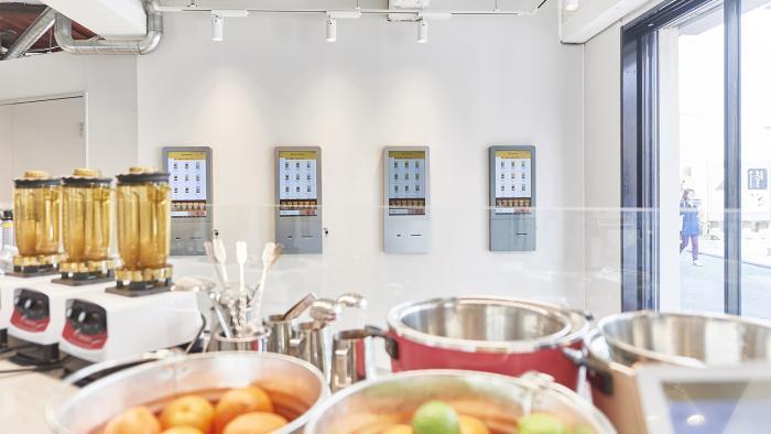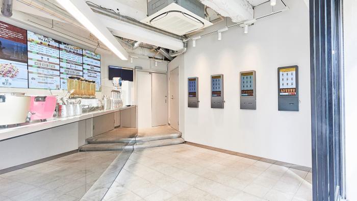 キッチンから発券機を見る。発券機は壁面埋め込みのデザイン。