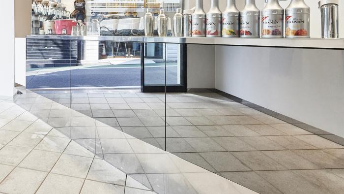 鏡張りのカウンターが外の風景を内部に取り込む。