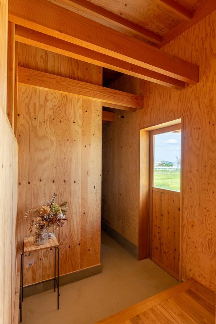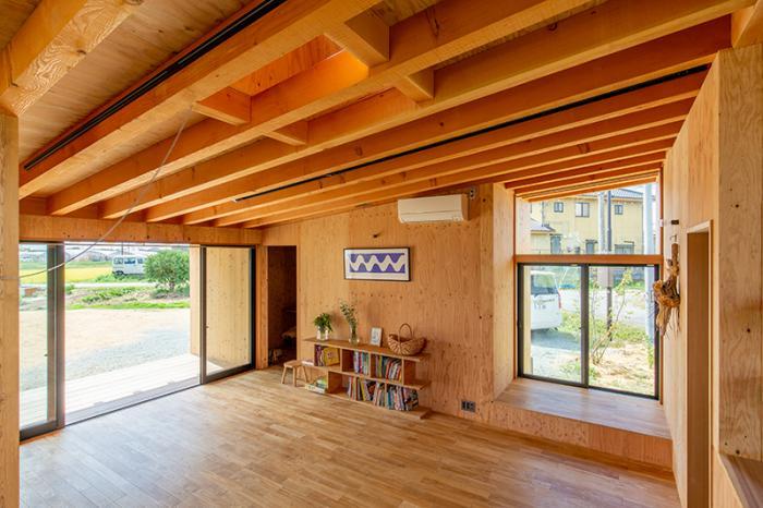 ローコストを実現するために、梁は綺麗に磨き上げる前の状態で使用したり、内・外壁の塗装はDIYしたり、内壁に使用する材を構造用合板としたり、工期を分ける計画を立てたり、工夫を重ねました。
