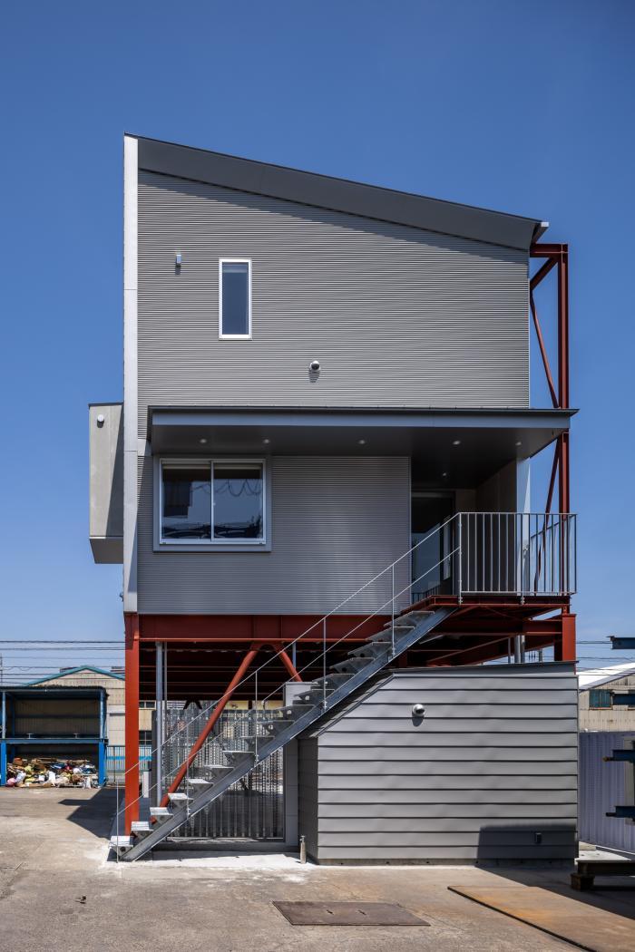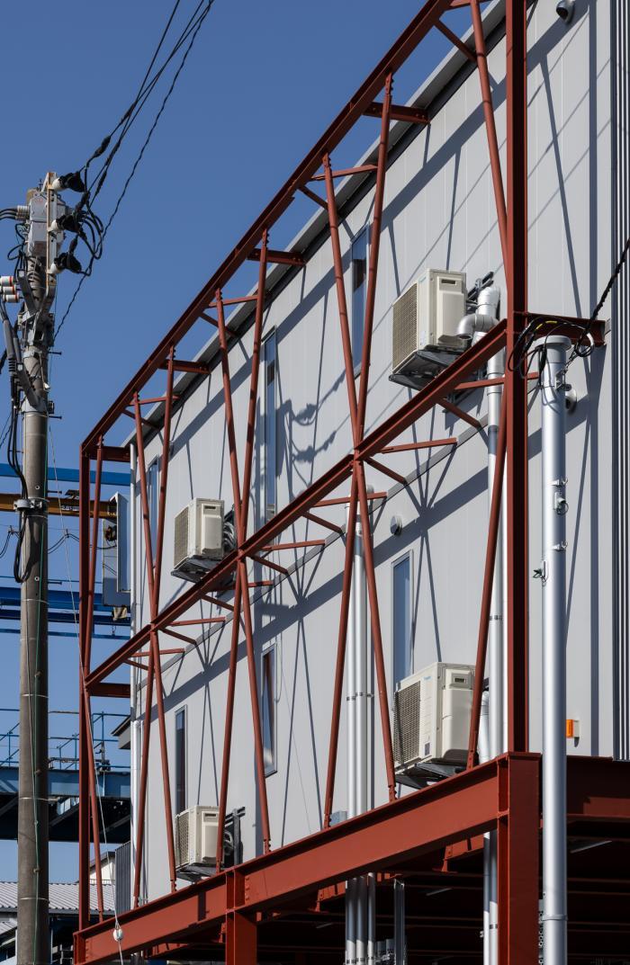 東側の外観:鉄骨の柱をずらしてメンテナンス用の足場スペースを設けた