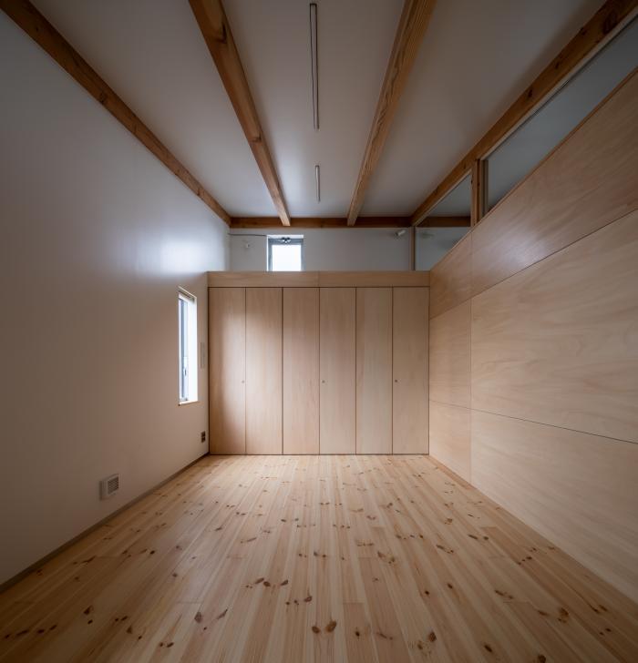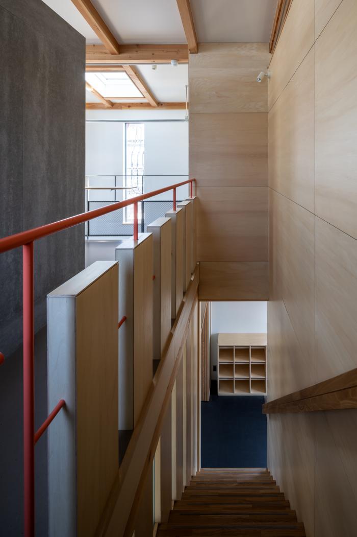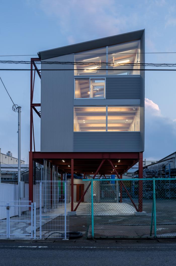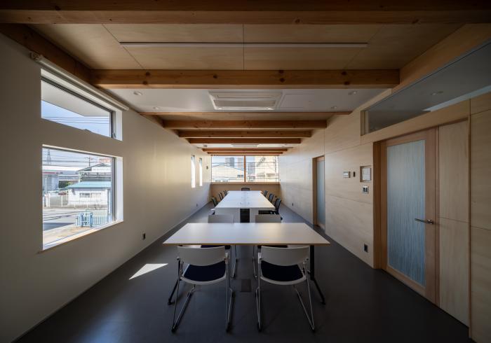 新事務所は、10人規模の2階オフィス空間を挟み、1階が資材置場、3階が休憩・仮眠室やランドリールームをまとめた生活空間になっています。内部空間は「オフィスと生活空間を明確に区分したい」との要望もあり、2階は水平方向に長いひと繋がりのオフィス空間としたのに対して3階は、休憩室に繋がる路地状の空間沿に生活空間が連なる「長屋」を意識した構成としました。