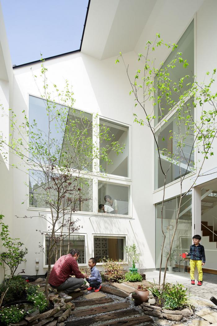 40坪の敷地に建蔽率を最大限つかいきり、外にも中にも居場所がある住宅を設計しました。c