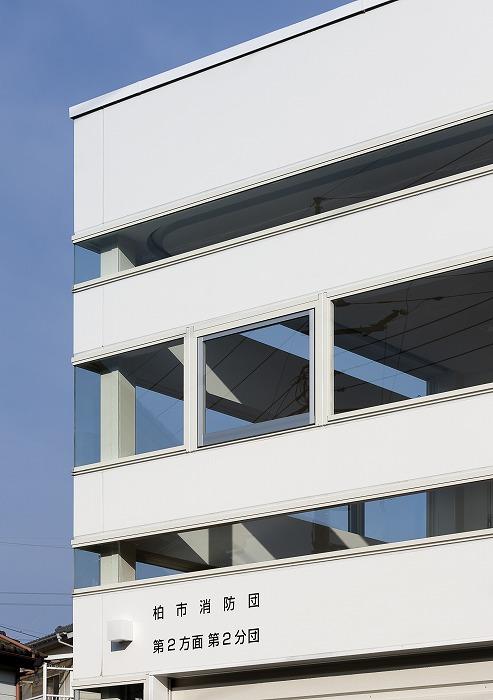 消防局との当初の打合せで、1階車庫に保管する工具等の盗難防止のため、1階の窓には面格子を付けるか、または排煙窓の様な高い位置の連窓にするか、選択を迫られた。意匠的な理由から排煙窓の様な形態の窓とした。