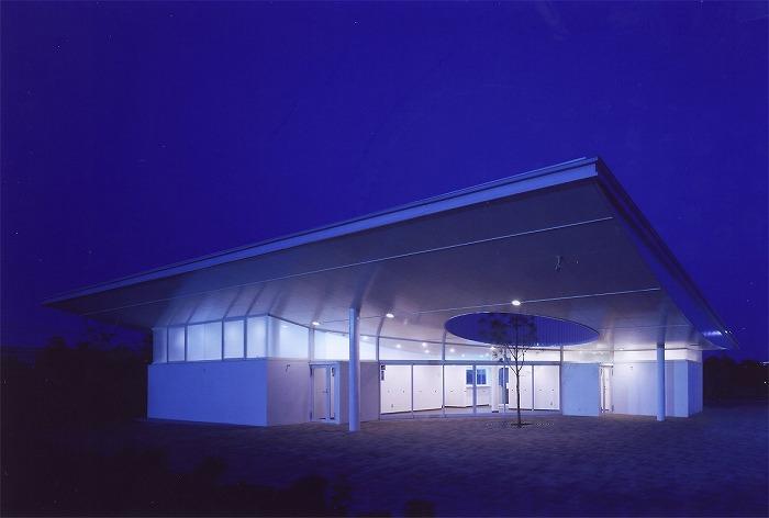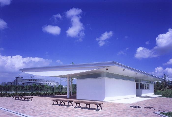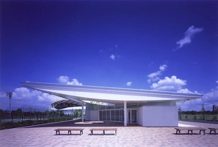 県立公園に建つスポーツ施設/周囲の環境を踏まえつつ、依頼者から求められた「軽い屋根」の表現とした