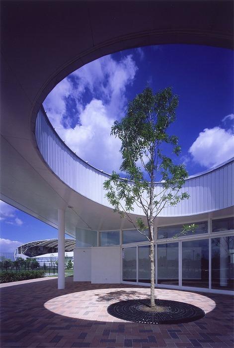 求められた諸室は更衣・シャワー、研修室・倉庫、便所、ラウンジ等である。プライバシーを強く求められる機能の中で、唯一開放的なラウンジ空間をテニスコートのある外部空間と繋ぐために、大きな軒下空間を作り出した。この軒下空間の中間領域を設定することにより、「内部空間としてのラウンジ」-「中間領域としての軒下空間」-「外部空間としてのテニスコート」の連続性を確保しようと試みた。更に、その屋根部分に開口部を穿ち、直下にシンボルツリーを植え、外部と内部の境界を意図的に曖昧にすることにより、空間の連続性を強調した。