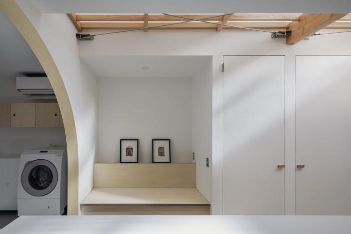ワンルーム構成である1階全体は、単調で間延びした印象とならないよう、アール垂れ壁や仕上げの切替えで緩やかにゾーン分けを行い、また機能や居場所を散りばめることで拠り所のある空間となるよう企図した。