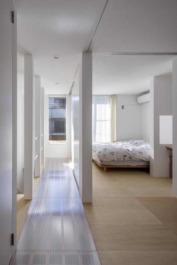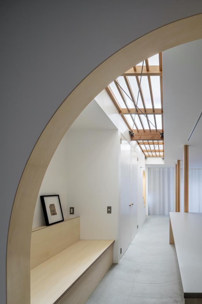 1階には南道路に面した大窓があるが、プライバシーの観点から居室と少し距離が欲しい。そこで窓と居室の間に縁側のように土間空間を設け、居室側と窓双方にカーテンを設置することで、光や視線の調整のみならず、縁側、居室の一部、玄関の延長など、用途の編集を受け入れられる空間とした。
