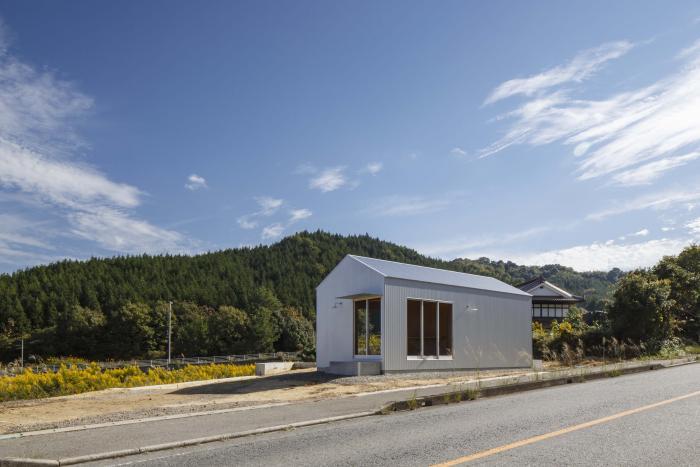 東広島市南部の山間へ新築した厨房を持つテイクアウト式の店舗。敷地は市街化調整区域内に位置するため周囲にはのどかな風景が広がり、街中よりもずっと空が大きく見える。初めて敷地を訪れた時、主役としての建築ではなく、風景や暮らしの中で黒子として佇む建築を作るべきだと考えた。 |
