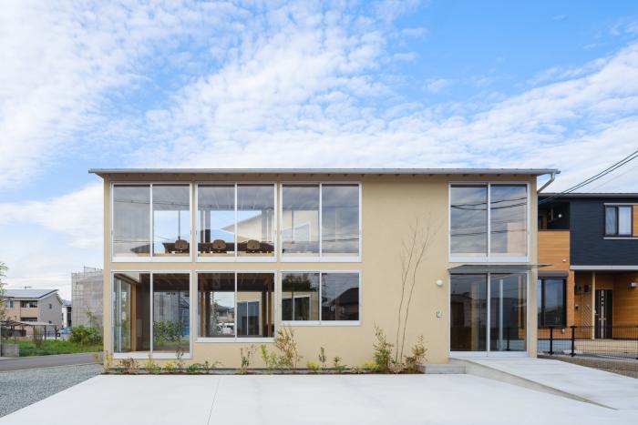 敷地は広島県福山市郊外の新興住宅地。周囲を個人住宅や集合住宅に囲まれ、東側以外の3面を道路に接する角地である。3方向道路という条件から、特徴的な開口部をもつ外観とすることで街との関係性を深め、福祉施設としての質を特徴付けることを考えた。 |