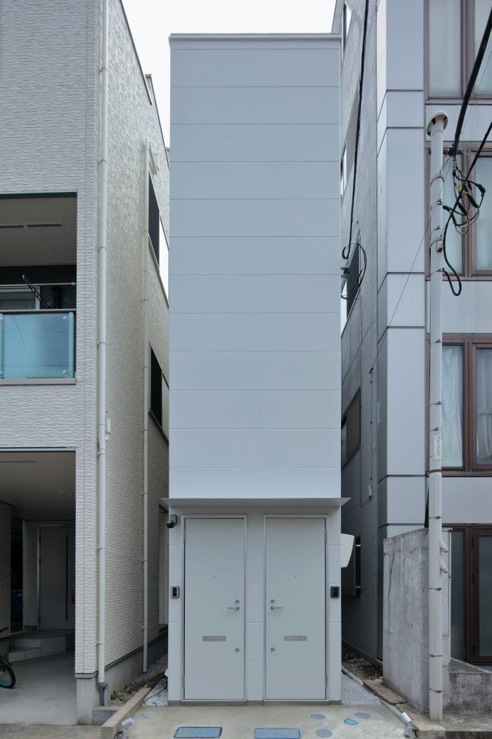 東京の下町。袋小路の路地のような間口が狭く奥行のある敷地に建つ重層長屋形式の賃貸併用住宅です。建物の間口は1間(1.82m)。1、2階それぞれにロフトを設けることで天井の高い住戸を上下に二つ積み上げたような長屋です。施主夫婦は2階に住まい、1階を賃貸住宅としています。