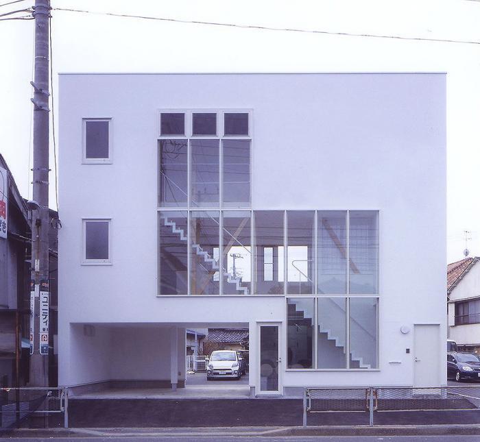 南側3層のスケルトン階段1階に玄関、2階に勝手口を配置しダブルアクセス可能にしいてます。西側道路は狭く高低差もありますが、最寄り駅までショートカット出来ます。陽光は竪格子越しの吹抜から取入れています。 |