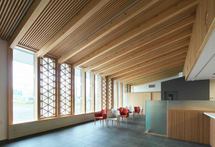 敷地は広島県福山市郊外の新興住宅地。周囲を個人住宅や集合住宅に囲まれ、東側以外の3面を道路に接する角地である。3方向道路という条件から、特徴的な開口部をもつ外観とすることで街との関係性を深め、福祉施設としての質を特徴付けることを考えた。 |