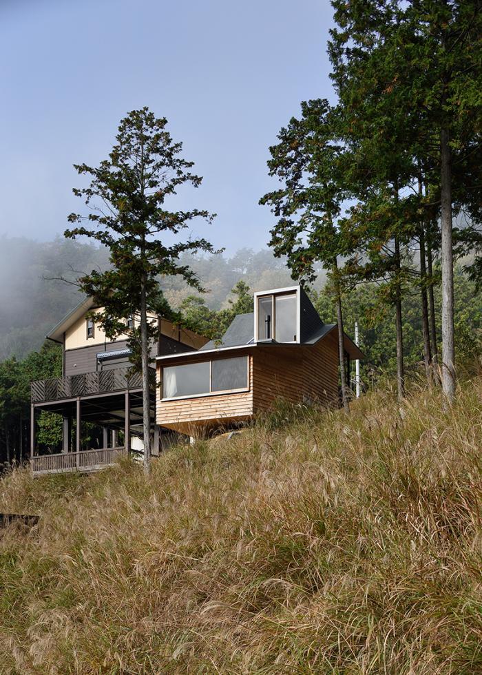 兵庫県の中山間地域に建つ週末住宅です。敷地の斜面をなぞるように回遊できる床を配置したり、階段室には外壁と同じ材料を使用したり天窓を設置したりと、屋内にいながらも屋外で活動しているような体験が生まれるように工夫しています。谷や尾根に向かう窓は山や空の景色だけを切り取り、風の通り道となります。